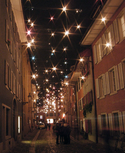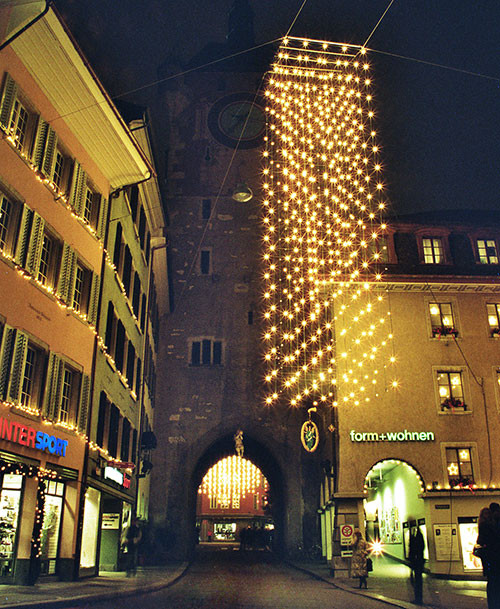 The catenary lighting is a principle element of the christmas market in this village near Baden Germany. Suspended across a series of Jakob tensile cables and fittings the lighting becomes an amazing feature enlivening the space at night. This particular installation uses LED luminares mounted to the cables, in this fashion any arrangement of illumination can be achieved, shapes, colours  and even effects. Suspended aloft the lighting maximises the usability of the space underneath creating post free pedestrian friendly spaces. Pendant luminares, tubes, LED’s are all possible with catenary lighting systems, Tensile is experienced in their design, fabrication and installation contact us today for further information on how to transform your space.
