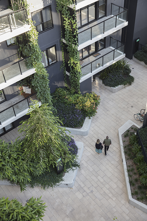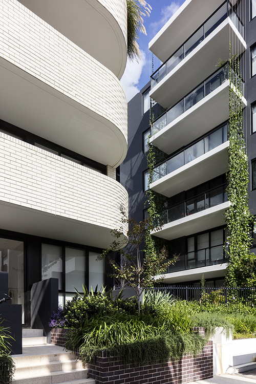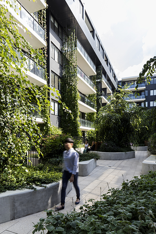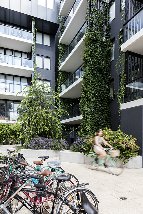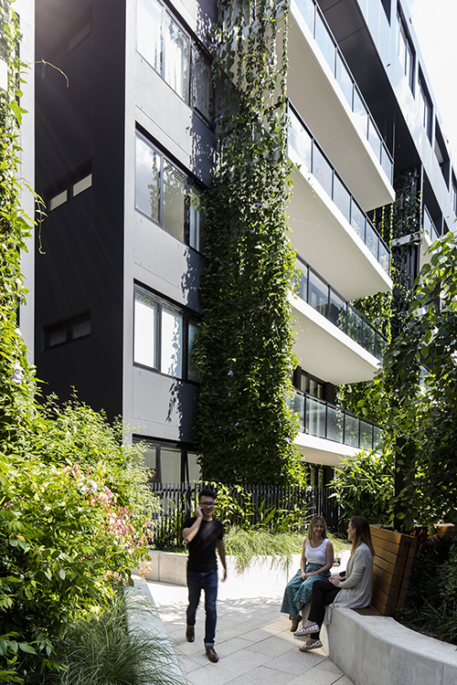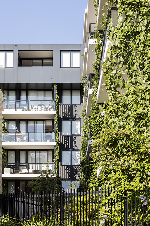 The gardens were designed by 360° Landscape Architecture with varying species used throughout in accordance with the various aspects and levels of solar access. The climbers provide a low maintenance, high impact alternative to other vertical gardens perfect for a medium density development such as Eve.