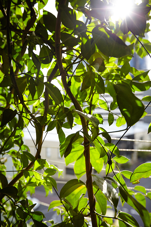 Working closely together Tensile and Fytogreen were able to develop and pre-grow system that enabled the climbers to be grown off site for 9 months. This enabled the 5 species of climbers to come to site providing 50% coverage from day one of installation. The cable system is made up of 3mm stainless steel wires in a custom zig zag pattern pre-made onto black powder coated frames. With much of the work occurring off site the facade went in over the space of 2-3 weeks with planters installed using a forklift.