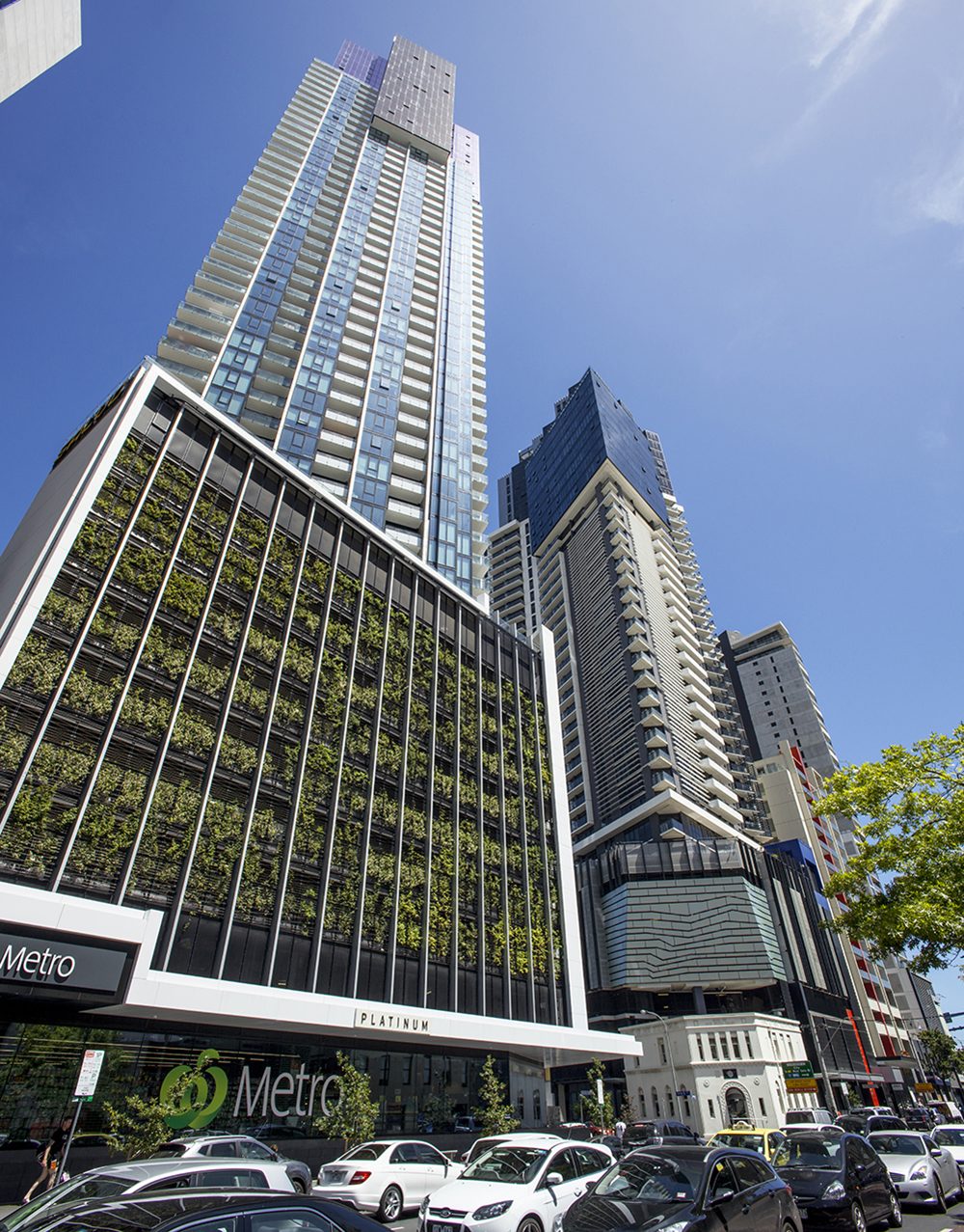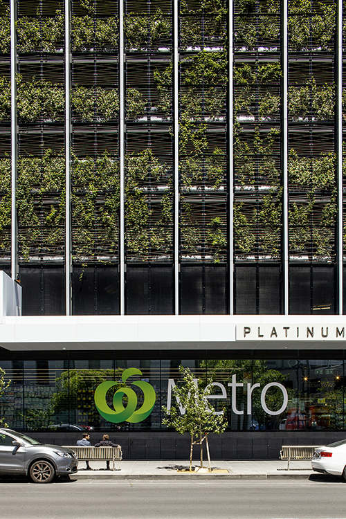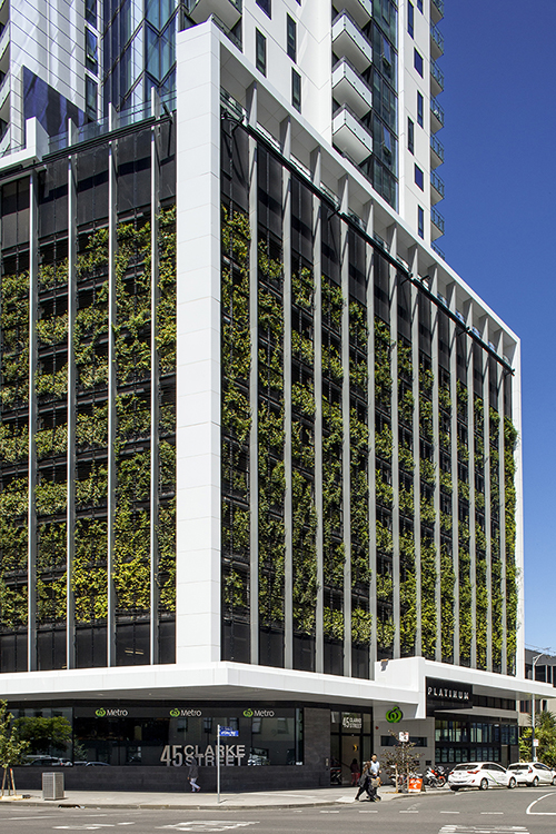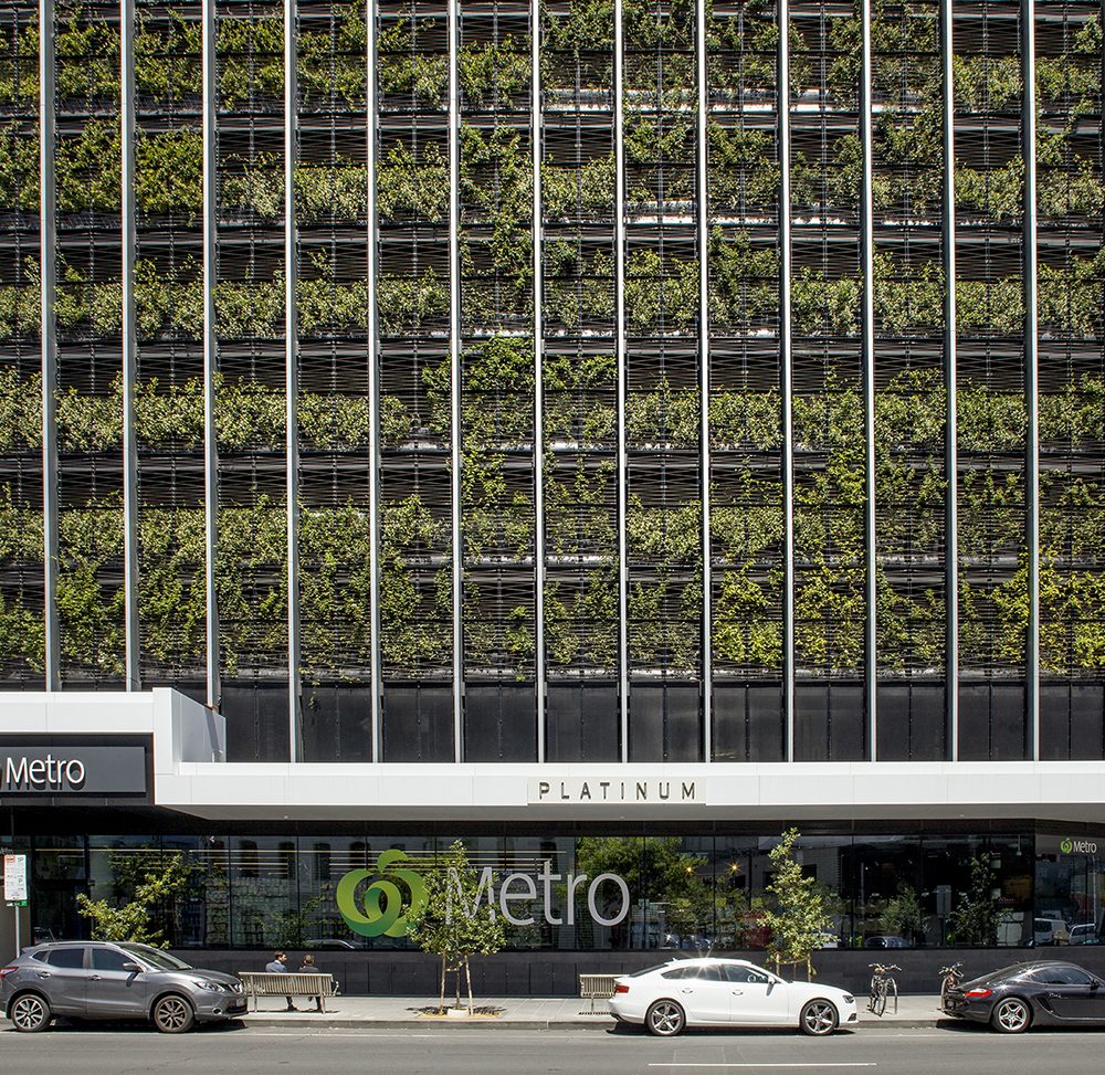 Large scale green facades are rarely easy and straight forward, it is almost like waiting for the planets to align. For Platinum Tower in Melbourne it took a concerted effort from Tensile, Fytogreen and landscape architects Aspect Studios to realise the 1700m2 green facade. Spanning between levels 2 to 10 the green facade is made up of 203 bays that wrap the podium north and east facades.