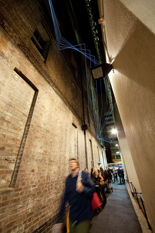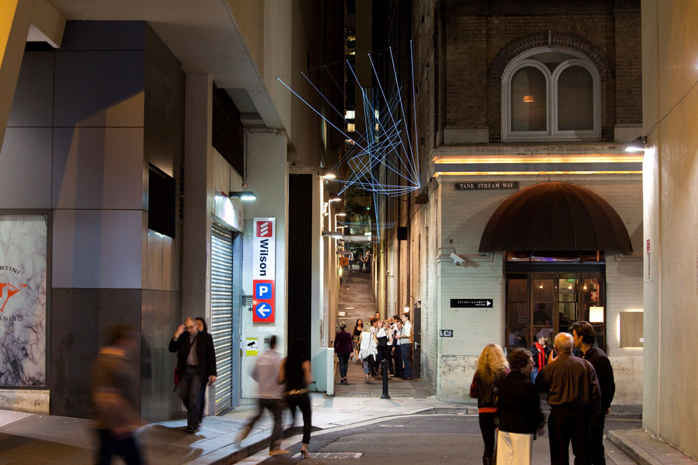 The catenary lighting installation for Abercrombie Lane was selected by the City of Sydney as a winning entrant for the “Art & About Festival 2012″. Titled, “Augmenting Spatiality”, the piece seeks to simultaneously reveal ambient and distinct urban spatial qualities between Sydney and Istanbul. The original design for the lights was based upon a similar lane-way to that of Abercrombie Lane in Istanbul, thus the dialogue between the two cities.