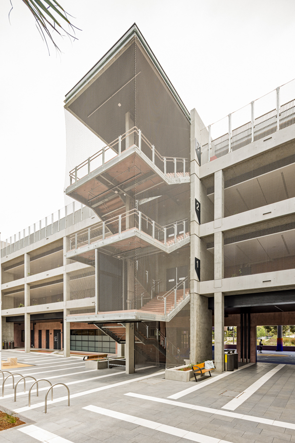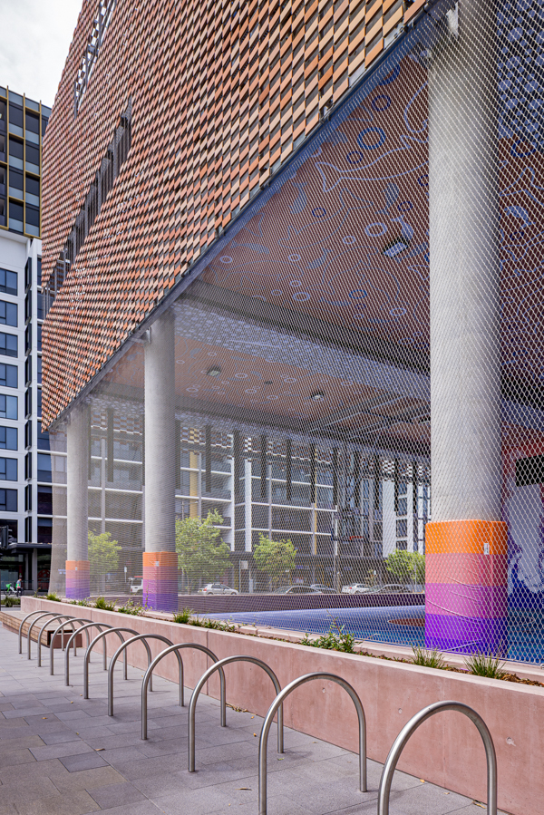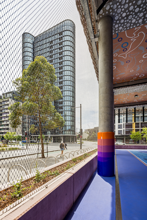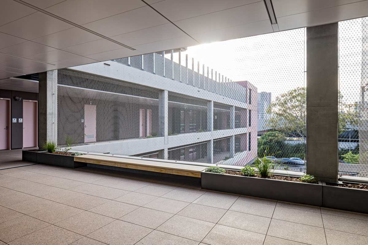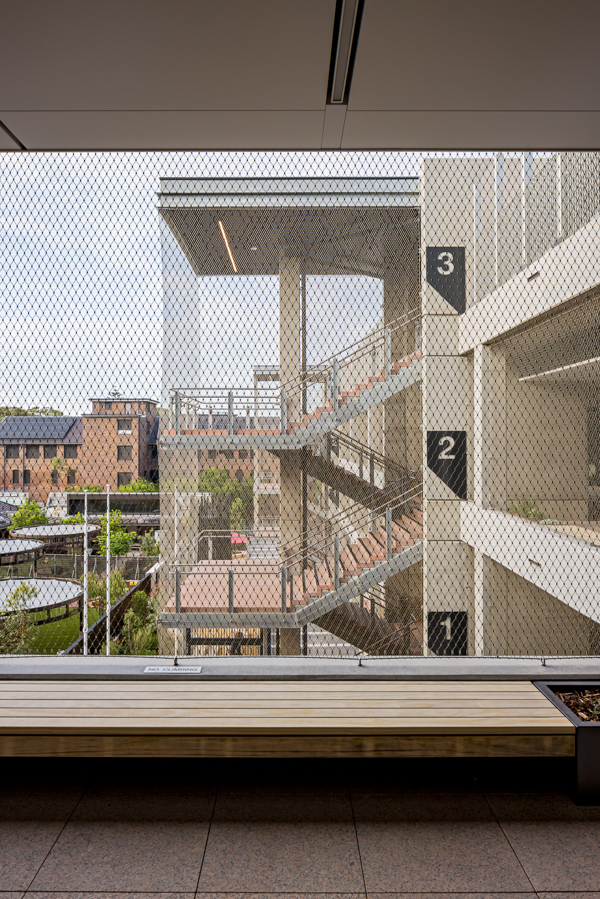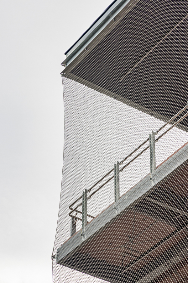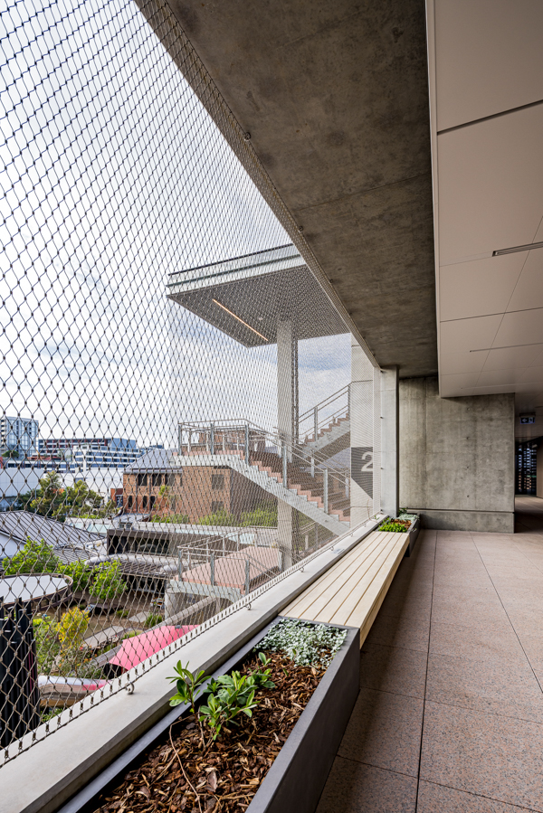Across the entire elevated circulation network, Tensile installed 40mm aperture, 2.0mm wire Jakob Webnet, engineered to meet C5 loading requirements. The mesh delivers fall protection, non-climbability, and exceptional visibility — aligning with BVN’s commitment to openness and lightness.