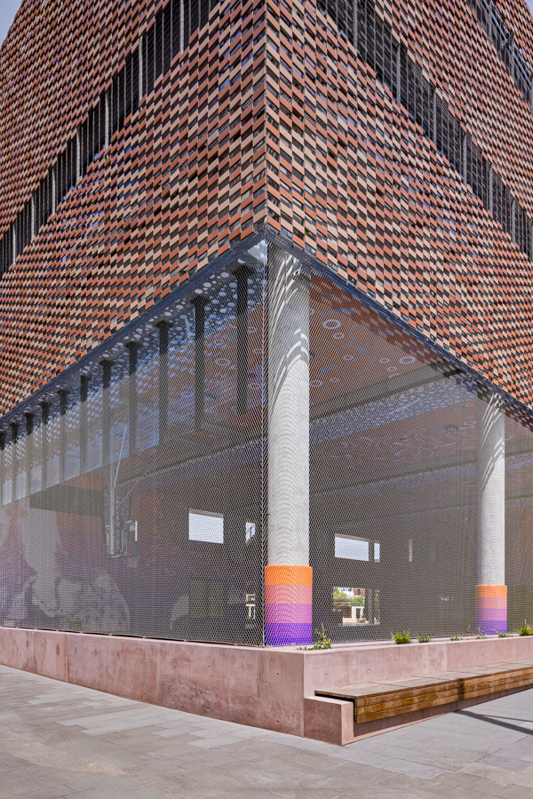 Perimeter cables lace directly back to the primary steel and concrete, allowing the mesh to act as a slender, continuous skin rather than a framed insertion.