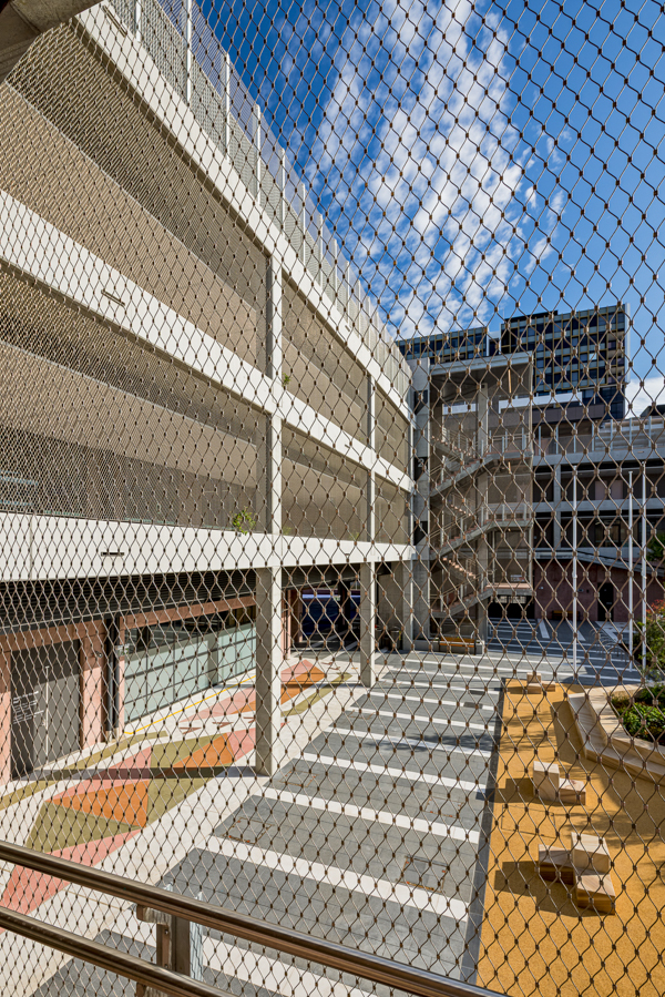 Webnet was the material that allowed all of this to coexist. In total 2300m² of full-height Webnet barriers across all upper-level balconies, learning terraces, external walkways, and circulation edges.