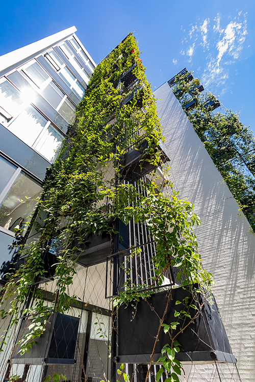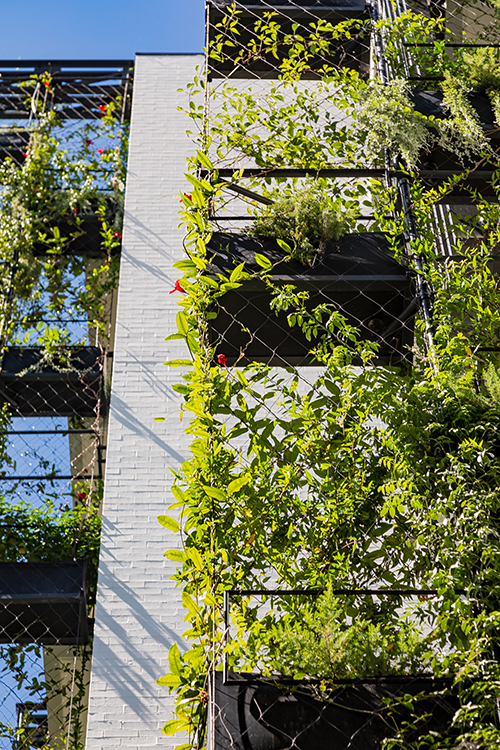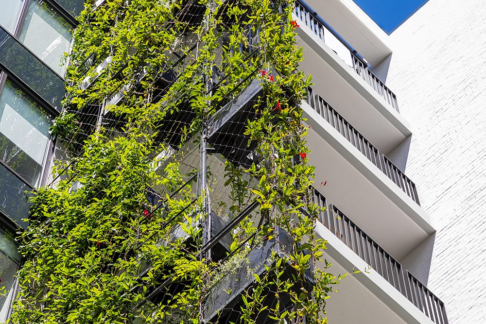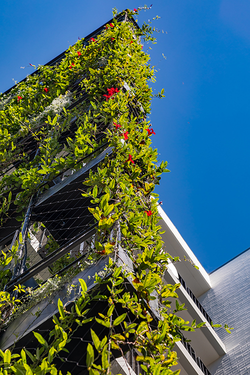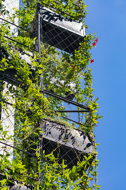 This involved installing a series of 6mm stainless-steel cables, all wrapped in webnet mesh, with the entire support structure finished in black. Planter boxes are suspended off the northern elevation of the building using the cables as support.