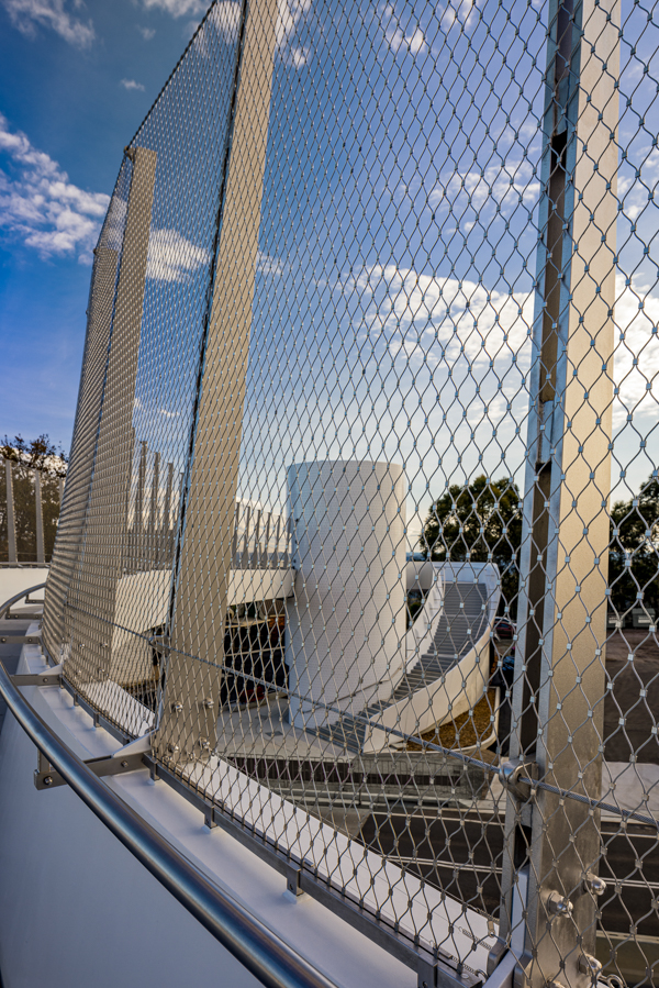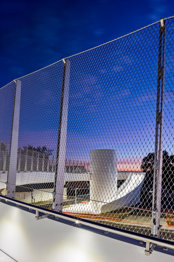 The screen barriers are a hybrid of Jakob Webnet mesh panels and cable perimeters – a combination that was a first for us. To create them, we used 40mm x 2mm Webnet, perimeter cables up to 8mm, and Jakob Inviss frames (which hide the lacing rope from view) at the base. Using Inviss frames allowed for a very clean integration with the base steel structure, and produced a nice finish.