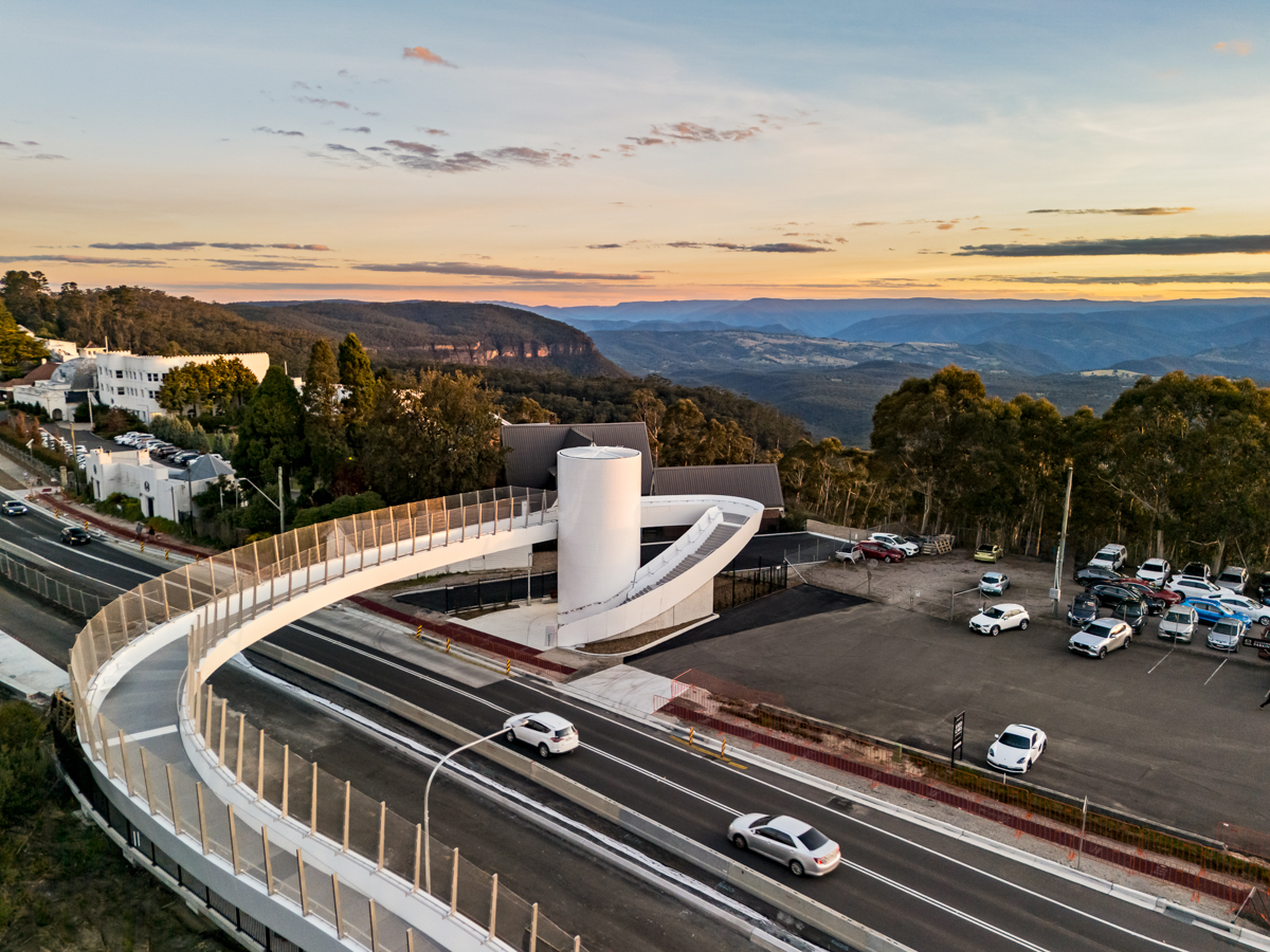 This contemporary steel bridge allows people of all abilities to safely cross the Great Western Highway and access the station. It features ramps, stairs and a white circular lift tower at its entrance that houses a glazed steel lift.