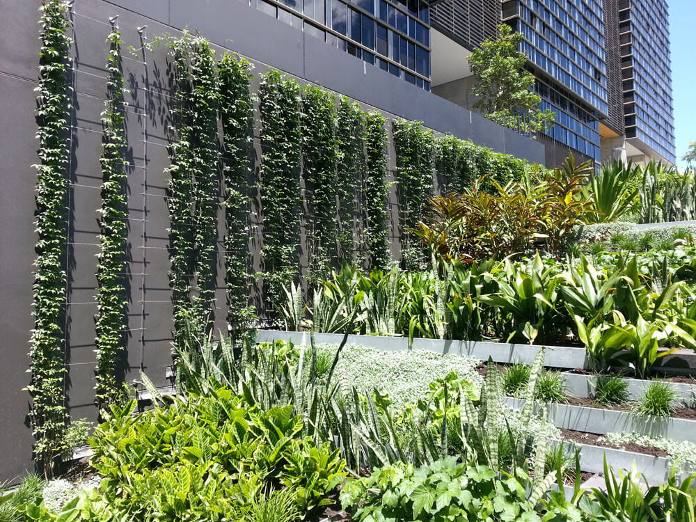 The green facade installed on the 34-storey One Central Park building is one of the largest in the world, involving the use of over 15,000sqm of vertical tensile cables.